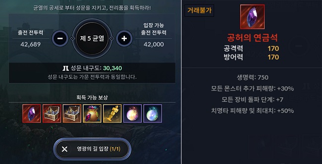 해당 콘텐츠에서 눈여겨봐야할 부분은 바로 보상이다. 현존 최강의 연금석인 '공허의 연금석'을 획득할 수 있기 때문. 공허의 연금석은 영광의 길, 제 5균열에서만 매우 낮은 확률로 획득할 수 있으며, 연금석 증폭 및 각성은 불가능하다.
