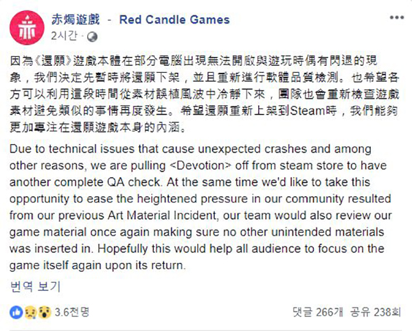 지난 19일 스팀을 통해 출시돼 국내를 포함해 글로벌 이용자들의 관심을 모았던 호러게임 ‘환원-디보션-(還願 -Devotion-, 이하 환원)이 최근 발생한 이슈로 인해 판매를 중단하고 스팀 상점 리스트에서 내려갔다.