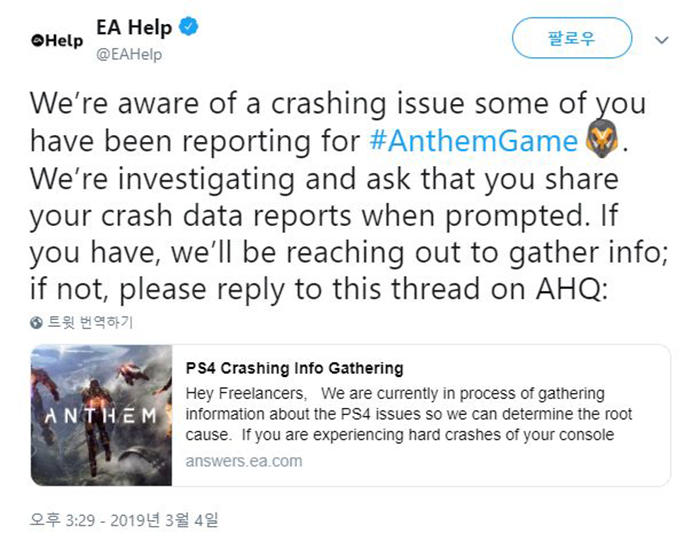EA는 EA Help 트위터를 통해 현재 ‘앤섬’ 플레이 중 크래시 문제를 겪고 있는 이용자들을 대상으로 데이터를 수집한다는 트위터를 올렸으며, 내용 중 별도의 링크를 통해 이용자가 겪고 있는 크래시 문제를 서술해 문제를 제보할 수 있도록 조치했다.