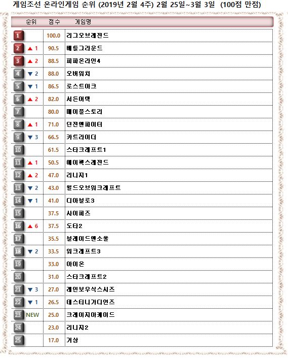 2월의 마지막주 온라인게임순위에서는 최근 인기를 모으고 있는 커스텀 모드인 ‘오토체스’로 순위권에 오른 ‘도타2’가 6단계 순위 상승하는 모습을 보였다. 또 최근 PC방 혜택 개편과 오프라인 이벤트를 개최한 바 있는 ‘크레이지아케이드’도 23위로 순위권에 올랐다.
