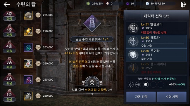 가문 내 캐릭터를 파견해 보상 및 경험치를 획득 가능한 수련의 탑 = 게임조선 촬영