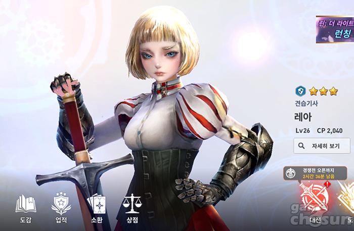 레아 합류 스토리까지 진행되고 나서야 처음으로 로비 메뉴에 방문하게 되고, 대표 캐릭터로 주인공이 아닌 레아가 위치한다. 사실 이 부분이 신의 한 수. 린 더 라이트브링어란 게임이 캐릭터 수집 RPG 로써 가진 매력이 로비에서 처음 만나게 되는 레아의 모델링에서 알 수 있다. 그런데 기껏 잘 구성된 메뉴인데 이동 시마다 반응이 느리다. 속터짐.