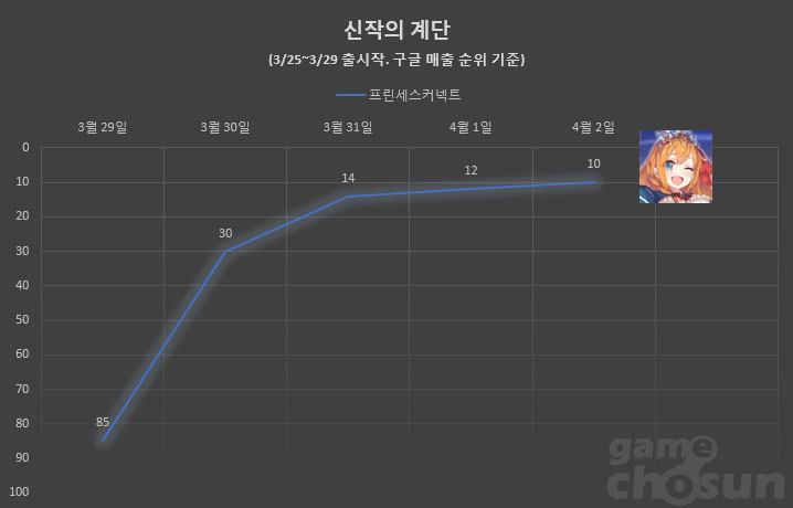 신작이 출시되고 오픈 첫 주는 가장 중요한 시기다. 게이머들에게 첫인상을 심어줄 수 있는 시기. 한번 제대로 해볼까 싶어 주말 귀한 여가 시간을 기꺼이 투자하고자 하는 게이머들의 냉정한 평가가 떨어지는 시기. 여기에 스토어 각종 집계 순위 어느 곳까지 올라서느냐에 따라 흥행 성적이 크게 좌우되기도 한다.안 아픈 손가락이 없다는 게임사가 애달픈 심정으로 보내게 되는 오픈 첫 주. '신작의 계단' 코너를 통해 지난 한주 간 출시된 주요 신작들의 첫 주말 성적을 알아본다.주요 출시작 요약프린세스커넥트 리다이브 (카카오게임즈, 3/28 출시, 85위 → 30위 → 14위 → 12위 → 10위)