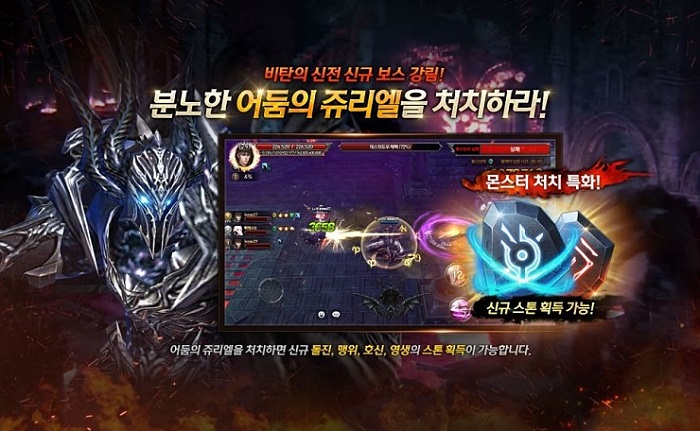 비탄의 신전의 새로운 보스 '어둠의 쥬리엘'도 추가된다. 어둠의 쥬리엘은 이벤트 뽑기를 통해 티켓을 획득한 후 입장할 수 있다. 어둠의 쥬리엘은 새로운 스톤인 '맹위의 스톤'과 '영생의 스톤', '돌진의 스톤', '호신의 스톤'을 드랍한다. 이 스톤은 새로운 세트 효과 옵션을 제공해 몬스터 공격력과 방어력을 대폭 증가시킬 수 있다.