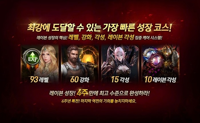 가장 먼저 눈에 띠는 것은 당연히 '4주완성, 초고속 성장 코스 시스템'이다. 최단기의 성장 코스로 최고 수준의 전투력까지 지원하는 이 시스템은 단순 레벨업만을 도와주는 것이 아니라 레벨과 강화, 각성, 레이븐 각성에 걸쳐 플레이어가 상위 콘텐츠에 보다 쉽게 접근할 수 있도록 도와주는 시스템이다.