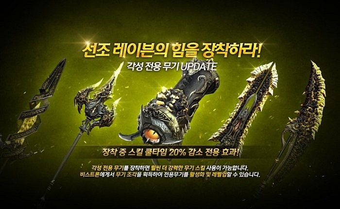 각성 전용 무기는 무기를 활성화하면 무기의 외형이 바뀌며, 레벨에 따라 높은 피해의 스킬 사용이 가능하다. 또한, 전용 효과로 장착 중 영구적으로 스킬 쿨타임이 20% 감소해 보다 역동적인 액션을 선보일 수 있다. 신규 각성 전용 무기는 비스트론이나 연금술에서 얻을 수 있는 전용 무기 조각으로 사용하여 활성화 및 레벨업 할 수 있다. 업데이트 직후에는 0레벨 또는 비활성화 상태로 시작하게 되며, 1~5단계까지 업그레이드가 가능하다.
