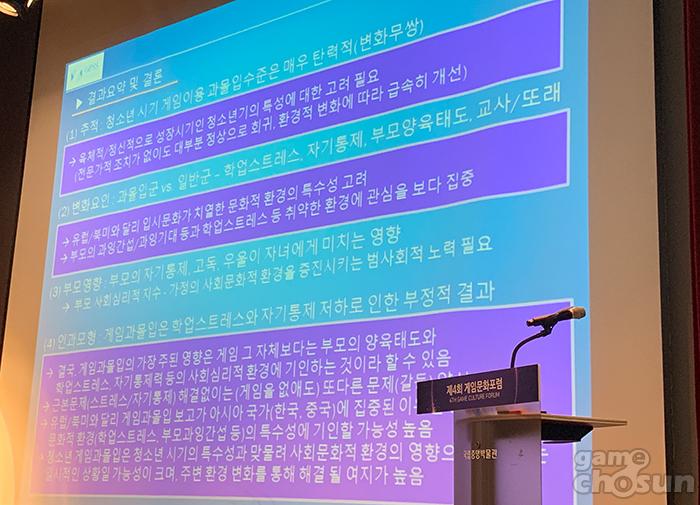 게임에 대한 다양한 의견이 포럼을 통해 제시된 가운데, 건국대 문화콘텐츠학과의 정의준 교수는 ‘게임과몰입, 진짜 이유는 무엇인가?’라는 주제로 지난 5년간 2000여명의 청소년을 대상을 진행한 추적조사를 기반으로 한 게임과몰입의 이유를 발표했다.