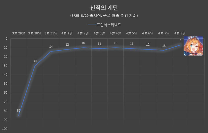 10위까지 올라가 봤던 프린세스커넥트가 올라설 듯 말 듯 아슬아슬한 위치에서 7위로 깜짝 반등에 성공했다. 8일(월) 기준 첫 업데이트로 신규 캐릭터 '쥰'의 인기 덕을 톡톡히 본 듯. 캐릭터성을 강조한 수집 RPG 답게 업데이트 반향이 큰 것으로.