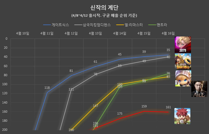 신작이 출시되고 오픈 첫 주는 가장 중요한 시기다. 게이머들에게 첫인상을 심어줄 수 있는 시기. 한번 제대로 해볼까 싶어 주말 귀한 여가 시간을 기꺼이 투자하고자 하는 게이머들의 냉정한 평가가 떨어지는 시기. 여기에 스토어 각종 집계 순위 어느 곳까지 올라서느냐에 따라 흥행 성적이 크게 좌우되기도 한다.안 아픈 손가락이 없다는 게임사가 애달픈 심정으로 보내게 되는 오픈 첫 주. '신작의 계단' 코너를 통해 지난 한주 간 출시된 주요 신작들의 첫 주말 성적을 알아본다.주요 출시작 요약2079게이트식스 (플레로게임즈, 4/9 출시,287위 → 118위 → 81위 → 61위 → 45위 → 39위 → 35위)