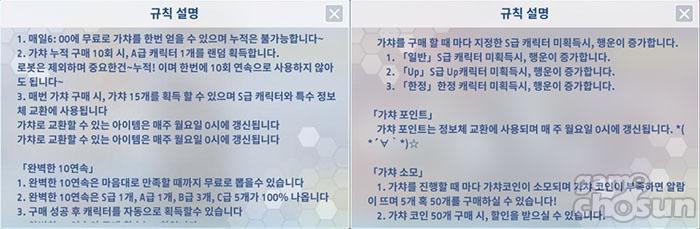 공개 이후 번역 오류를 이유로 변경된 캐릭터 뽑기 룰. 변경 전(좌), 변경 후(우)