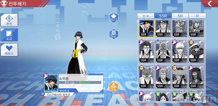 원작 주인공들의 성장 단계에 따라서도 플레이어블 캐릭터를 나누어 놨다. 주인공 쿠로사키 이치고만 해도 일반과 만해, 수행, 호로화 버전 시로사키 이치고 등으로 나뉘고, 아이젠 소스케도 아란칼 버전으로 나뉜다. 여기에 게임 소개에 '호정 13대' 와 '아란칼 10체' 캐릭터들까지 모두 구현했다고 하길래 캐릭터 무지하게 많겠다- 싶었는데 구현된 캐릭터가 생각보다 적다. 그리고 무엇보다 SSR 캐릭터가 SR 이나 R 캐릭터보다 많은 희한한 구조를 보여준다. 원작에서 무게 좀 잡았다 싶은 캐릭터는 죄다 SSR.