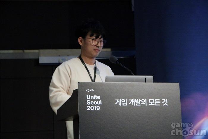 22일 서울 삼성동 코엑스 그랜드볼룸에서 진행된 '유나이트 서울 2019'에서 퍼니파우의 최재영 CTO와 류재성 팀장이 오는 6월 출시를 앞두고 있는 '일곱개의대죄:그랜드크로스'의 개발과 관련해 '애니메이션 감성과 개발 최적화'를 주제로 강연했다.
