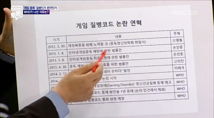 5월 21일, 공영방송 MBC에서는 '게임 중독이 질병인가 편견인가'를 주제로 100분 토론을 진행했다. 이는 세계보건기구(이하 WHO)의 게임 중독을 정식 질병코드화하는 것에 대한 내용을 다루고 있다.
