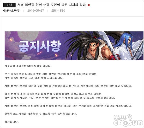 서버 불안정 현상 수정 지연에 따른 사과 공지 게재