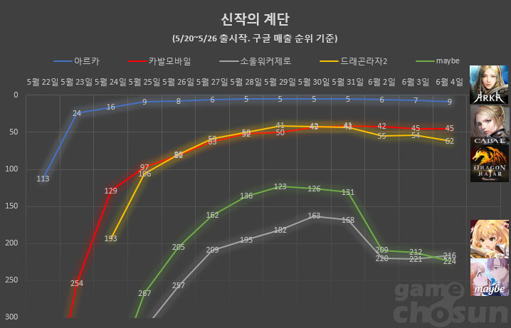 아르카가 최고 매출 5위까지 달성, 일주일이 지난 지금도 9위를 지키고 있다. 상위권 수성을 뚫지는 못했으나 그렇다고 순위가 크게 내려갈 것으로 보이진 않는 상황. 이 뿐만 아니라 같은 기간에 나온 MMORPG 형제 카발모바일과 드래곤라자2로 지난 주 순위 비슷하게 지키고 있다. 특이한 점이라면 먼저 치고 올라갔던 드래곤라자2가 카발모바일의 뒷심에 조금 밀렸다는 것.