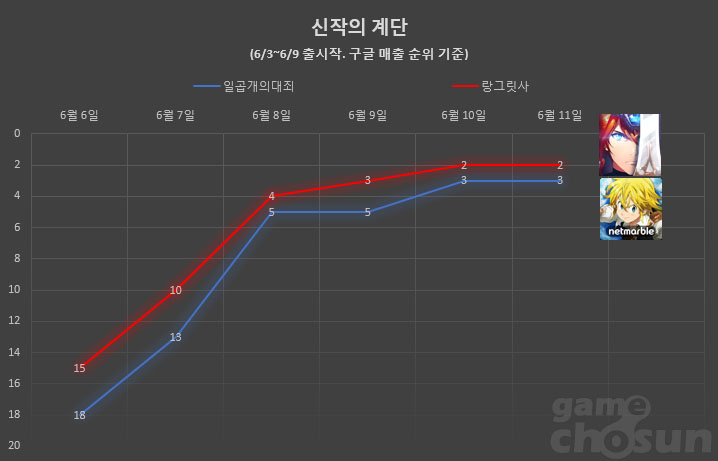 일곱 개의 대죄 (넷마블, 6/4 출시, 18위 → 13위 → 5위 → 5위 → 3위 → 3위)