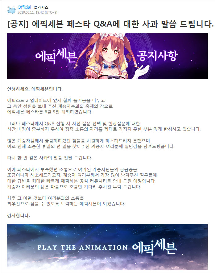 에픽세븐 페스타 Q&A관련 사과문 공지 = 에픽세븐 공식 커뮤니티