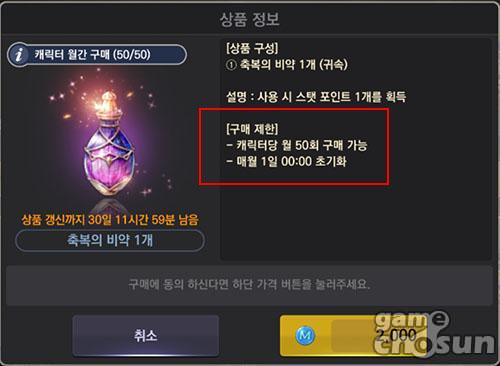 매월 한정 수량 구매 가능한 축복의 비약 = 게임조선 촬영
