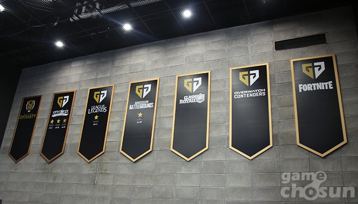 젠지 소속 e스포츠 구단과 우승 이력이 적힌 깃발 = 게임조선 촬영