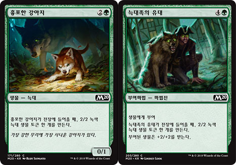 흉포한 강아지는 녹색에서 가장 쉽게 개체수를 늘리는 생물입니다. 늑대족의 유대는 비용이 좀 부담되지만, 기존 생물을 강화시켜주므로 꼭 생물 개체수를 늘리는 전략이 아니더라도 이길 수 있게 해줍니다.