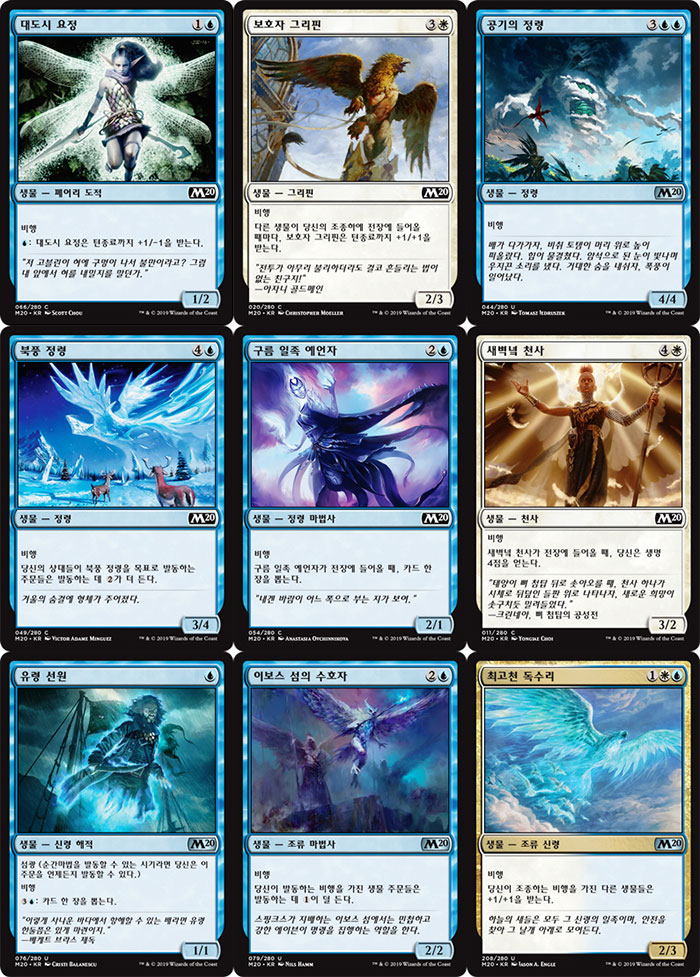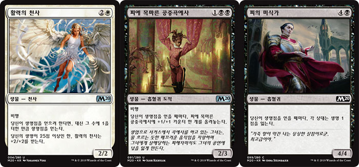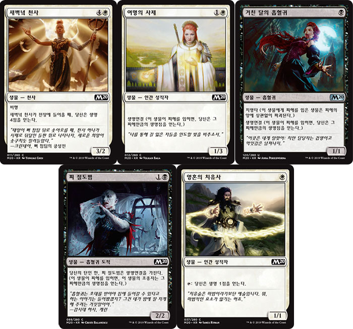 구름 일족 예언자는 2/1 비행이라는 준수한 스펙에 카드를 한 장 추가해주는 굉장히 좋은 생물이며, 새벽녘 천사는 4점의 생명점을 회복해주어 데미지 레이스에서 우위를 점할 수 있게 해줍니다.
