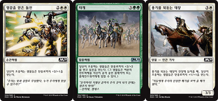 영감을 얻은 돌진, 타개는 내 생물 전체를 강화해주므로 게임을 마무리하기 충분할만큼 강력한 주문입니다. 영감을 주는 대장 또한 내 생물 전체를 강화해주지만, 보통 영감을 얻은 돌진이나 타개를 사용하기 전에 중간다리 역할로 피해를 누적시키는 용도로 사용합니다.