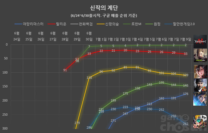 안 아픈 손가락이 없다는 게임사가 애달픈 심정으로 보내게 되는 오픈 첫 주. '신작의 계단' 코너를 통해 지난 한주 간 출시된 주요 신작들의 첫 주말 성적을 알아본다.