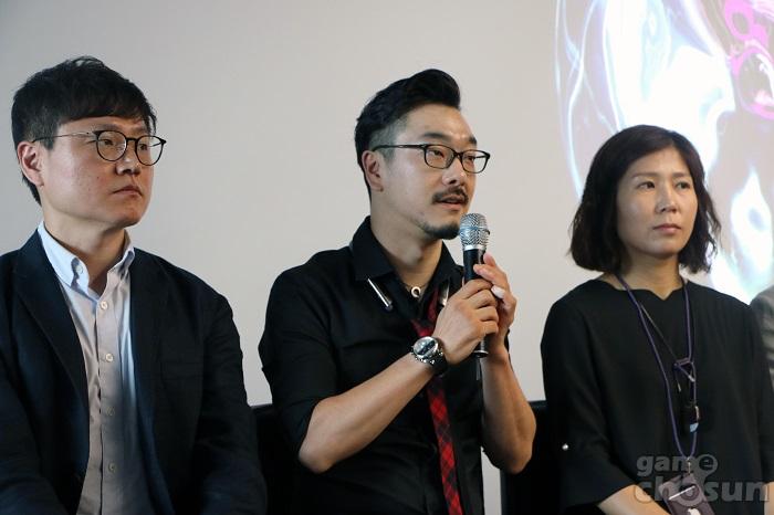 질문에 대답 중인 오지현 에반젤리즘 팀장 = 게임조선 촬영