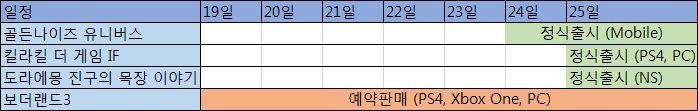 '길티기어' 시리즈로 유명한 아크시스템웍스는 신작 대전 격투 게임 '킬라킬 더 게임 IF'를 25일 선보이며, 반다이남코 또한 같은 날, '도라에몽 진구의 목장이야기'가 출시된다. 19일부터는 두터운 팬층을 거느리고 있는 '보더랜드' 시리즈 신작, '보더랜드3' 예약 판매가 시작된다.
