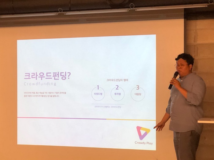 크라우드펀딩에 대해 설명하고 있는 '김민수' 크라우디 PM = 게임조선 촬영