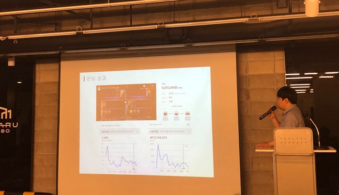 '강경태' 겜토리 대표가 크라우디를 통한 펀딩의 성과에 대해 발표하고 있다 = 게임조선 촬영
