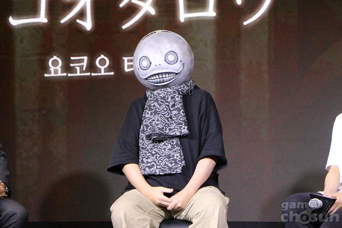 크리에이터 디렉터 '요코오 타로'가 공식 자리에서 쓰고 나오는 가면이 '에밀'이다. = 게임조선 촬영