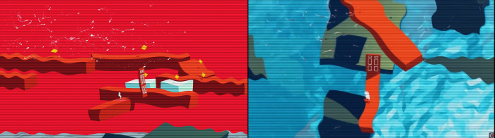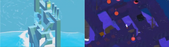 문에 도달하기 위해서 시점에 따라 모양이 변하는 플랫폼을 여러 방향에서 관찰하여 길을 만들거나, 일그러진 화면을 되돌리기 위해 특정 블록을 만지는 등 맵에 대한 관찰력이 필요하다.