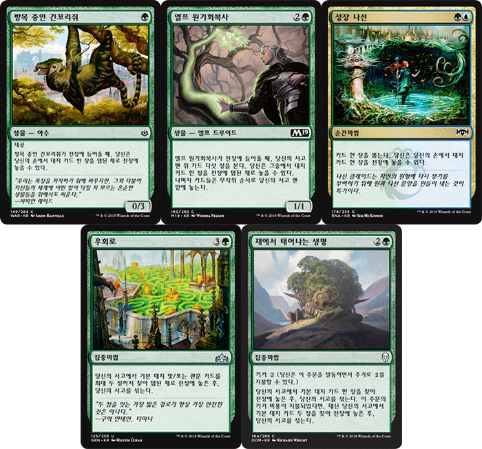 첫 턴에 방목 중인 긴꼬리쥐를 내려놓고, 두 번째 턴에 엘프 원기회복사나 성장 나선, 재에서 태어나는 생명 중 하나를 사용한 뒤, 세 번째 턴에 우회로나 재에서 태어나는 생명을 키커 비용을 지불해서 사용한다면, 네 턴째에 대지 8개가 모이게 되고 풍경 변화를 강력하게 사용할 수 있습니다. 이는 가장 강력한 패턴이며, 꼭 이런 베스트 패턴이 아니더라도 이렇게 많은 장수의 대지 확보 수단이 이 덱을 매끄럽게 사용할 수 있도록 해준다는 점이 좋습니다.