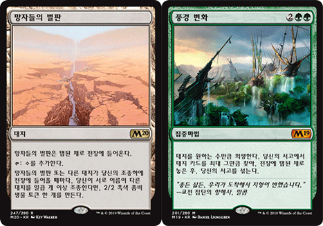 또한 풍경 변화를 사용할 때 반드시 모든 대지를 희생해야 하는 것은 아닙니다. 상대 덱에 광역 제거 수단이 많다면, 내 대지를 적당히 찾아와서 토큰을 만들어낼 수 있는 대지가 내 덱에 어느 정도 남아 있게 플레이하는 것도 중요합니다.