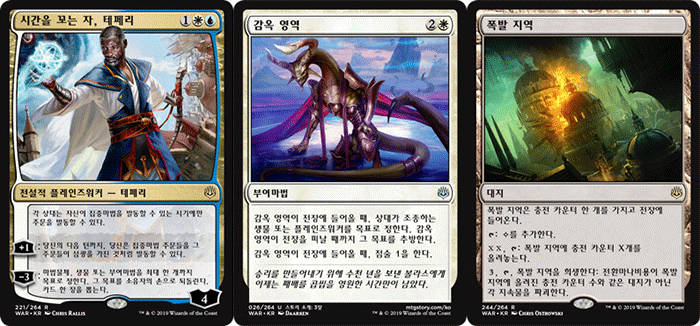 시간을 꼬는 자, 테페리는 ‘풍경 변화’ 같은 카드가 무효화당하지 않도록 해줍니다. 또한, 이 생물 덱에게 강력한 ‘시믹 운명의 결합점’ 같은 덱에 대응할 수 있는 역할도 가지고 있습니다. 상대가 광역 생물 제거 수단이 많은 에스퍼 계열의 덱이라면, 풍경 변화를 상대 턴 종료단에 사용함으로써 대부분 집중 마법인 광역 생물 제거 수단을 회피하고 게임을 승리할 수 있기도 합니다.