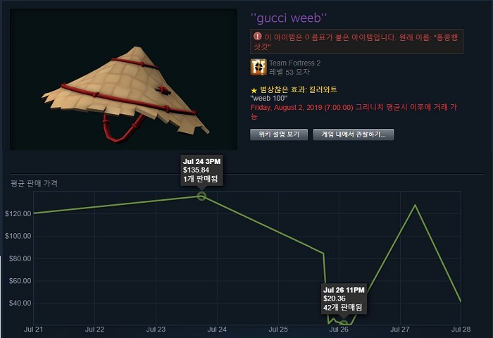 반면 범상찮은 '홍콩행 삿갓'의 경우 135달러였던 가격이 20달러까지 하락했다. 버그가 해결된 29일에도 시세는 여전히 안정되지 않은 모습을 보여주고 있는 상태다.