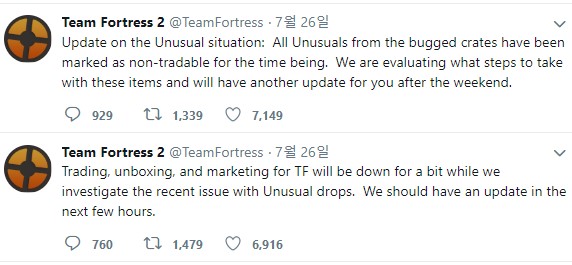 팀포트리스2는 26일 공식 트위터를 통해 버그 아이템의 거래를 중지했으며, 후속 조치에 대하여 논의 중이라고 밝혔다.