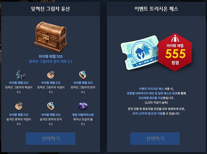 한편, 암살자 업데이트와 함께 점핑 이벤트가 함께 진행된다. 이벤트 페이지 내에서 잊혀진 그림자 유산이나 이벤트 트리시온 패스를 받아 바로 50레벨 달성 및 로헨델 대륙까지의 모든 퀘스트를 완료할 수 있으며, 555레벨의 장비를 지급받을 수 있다. 이를 통해 545레벨 제한의 신규 지역 '욘대륙'을 즉각해서 탐험할 수 있다.