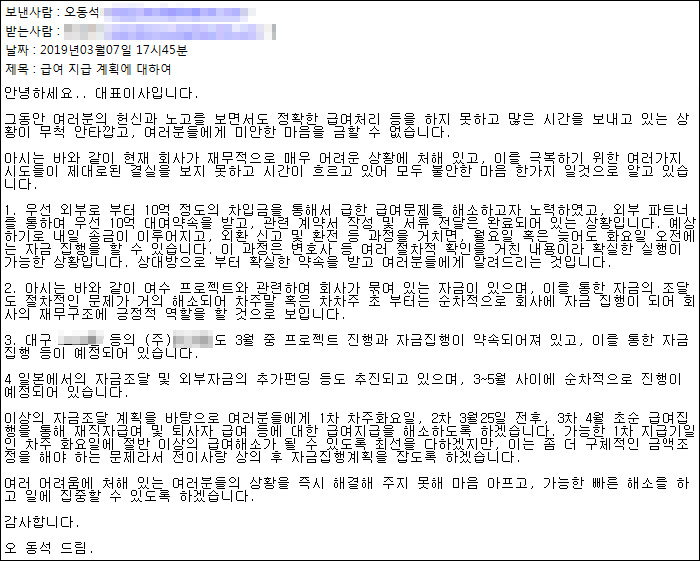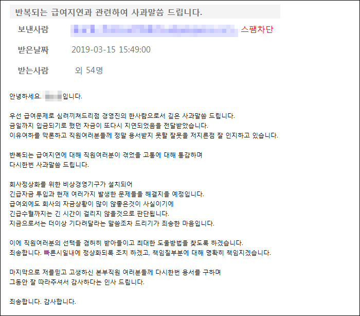모든 내용은 대체적으로 '대동소이'하다. '이번에도 임금 지급이 어려워 미안하다. 사태 해결을 위해 최선을 다하고 있다'는 내용이다. 하지만 사태는 결국 지금까지 해결되지 않고 있다.