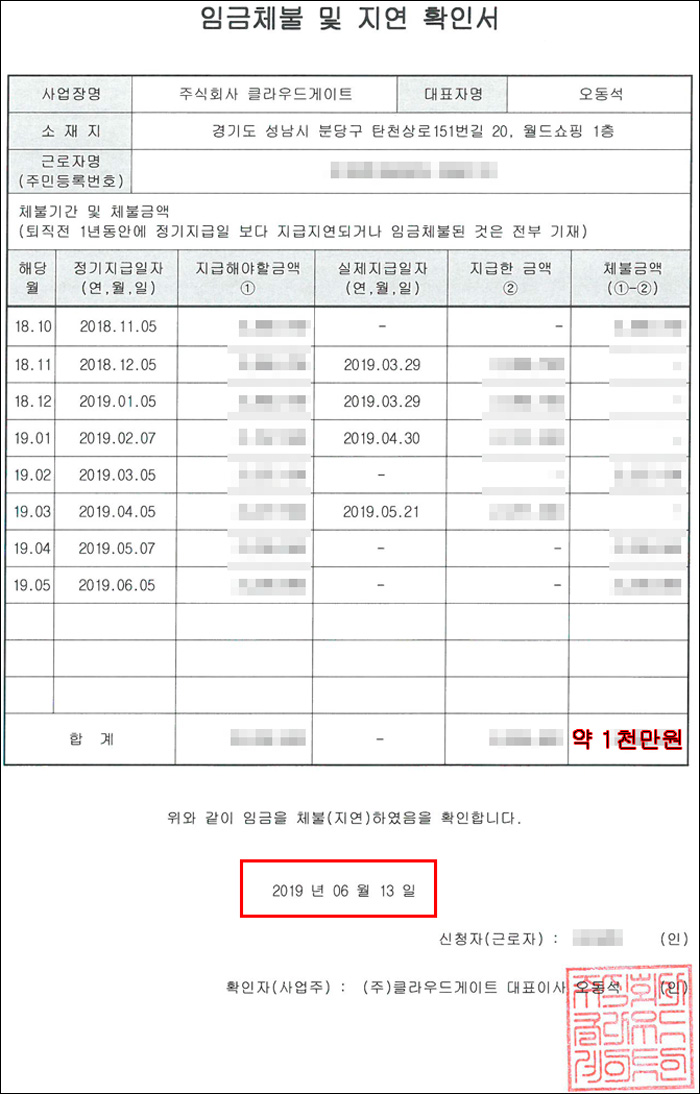 A씨(올해 6월 퇴사)의 체불 확인서. 회사를 다니면 다닐 수록 체불액이 불어나는 상황이었다고 한다.