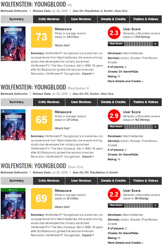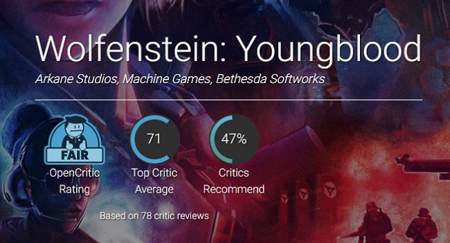 한편, 같은 날 발매된 울펜슈타인 시리즈의 첫 VR 작품, '울펜슈타인:사이버파일럿'의 경우는 영블러드보다 더 낮은 점수(메타크리틱 - 50점/ 오픈크리틱 - 51점)을 받으며 혹평이 이어지고 있다.