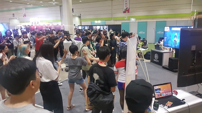 유비소프트 부스에는 '저스트댄스2019' 하나만 준비됐지만 참가자들의 뜨거운 반응은 다른 부스 못지 않았다. 체험회에는 동시에 여러 유저가 참여하여 마치 플래시 몹같은 광경을 연출했다.