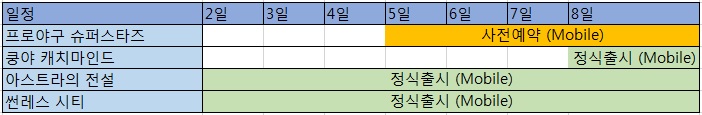8월 1주차에 출시하는 게임은 넷마블의 '쿵야캐치마인드(이하 캐치마인드)'와 드림아이디어소프트의 '아스트라의전설', 5byte의 '썬레스시티:야경게임' 까지 총 3종이다. 그리고 게임빌의 '프로야구슈퍼스타즈(이하 슈퍼스타즈)'가 사전예약을 시작한다. 모두 모바일 플랫폼의 작품.