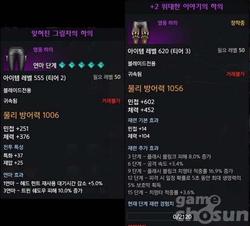 연마를 사용하던 욘 이전의 장비와 재련을 사용하는 욘 이후의 아이템 비교 = 게임조선 촬영