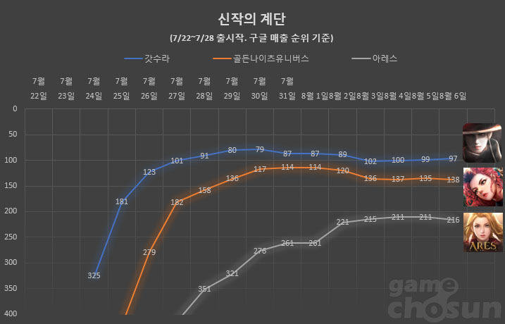 안 아픈 손가락이 없다는 게임사가 애달픈 심정으로 보내게 되는 오픈 첫 주. '신작의 계단' 코너를 통해 지난 한주 간 출시된 주요 신작들의 첫 주말 성적을 알아본다.