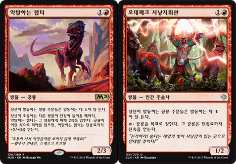 약탈하는 랩터는 내 생물의 소환 비용을 줄여줌과 동시에, ‘찢는턱 랩터’의 격노 능력을 발동시킵니다. 공격력 상승 효과도 있어서, 보조 수단이라고는 했지만 상대의 생명점을 크게 줄일 수 있고 ‘태초의 굶주림, 갈타’를 소환하는 데 있어서도 큰 도움이 됩니다. 단, 이 생물이 전장에 있을 때 ‘오테페크 사냥지휘관’을 소환하면 전장에 들어오자마자 무덤으로 간다는 점을 조심해야 합니다. ‘거대 생물 몰이꾼’은 소환하면서 즉시 3/3이 되므로 일반적인 경우에는 죽지 않지만, 전장에 공룡이 약탈하는 랩터밖에 없는 상태에서 ‘거대 생물 몰이꾼’을 소환하고, 2점의 피해를 받은 상태에서 상대가 약탈하는 랩터를 죽일 경우 거대 생물 몰이꾼 또한 다시 방어력이 1로 내려가면서 자동으로 죽는다는 점을 조심해야 합니다.