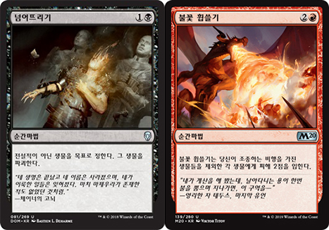 불꽃 휩쓸기는 마찬가지로 오르조브 흡혈귀처럼 생물의 개체수를 늘려서 압박하는 어그로 덱이나, 반트 풍경변화처럼 한꺼번에 많은 좀비를 쏟아내는 덱을 상대할 때 아주 좋습니다. 덤으로 ‘찢는턱 랩터’의 격노 능력도 격발시킬 수 있습니다.