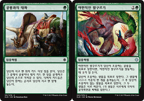 공룡과의 대화는 이 덱이 강력한 패턴을 유지하도록 도와주는 매우 중요한 주문입니다. 앞서 약점에서 설명드렷듯 항상 좋은 패턴의 손패를 받기 어려운 이 덱에게, 손패에서 부족한 부분을 찾아 채워줄 수 있는 카드이기 때문입니다. 강력한 공룡은 있으나 보조할 생물이 없는 경우, 또는 반대로 보조할 생물은 있으나 강력한 공룡이 없는 경우, 둘 다 만족하지만 대지가 부족한 경우 등등. 이 덱이 스탠다드 환경에서 경쟁력 있는 덱으로 살아남게 만들어주는 일등공신이라고 할 수 있겠습니다.
