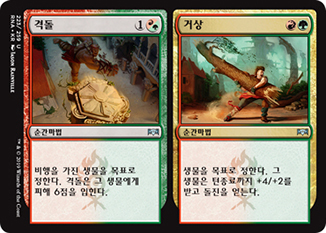 격돌 // 거상은 좀 더 빠르게 상대의 생명점을 깎아내기 좋은데, 특히 ‘썩어가는 레기사우루스’ 처럼 공격력은 높으나 돌진이 없는 생물에게 격돌로 돌진을 부여하는 것이 강력합니다. 격돌은 그 외에도 ‘태초의 굶주림, 갈타’를 빠르게 소환하도록 도와주기도 합니다.